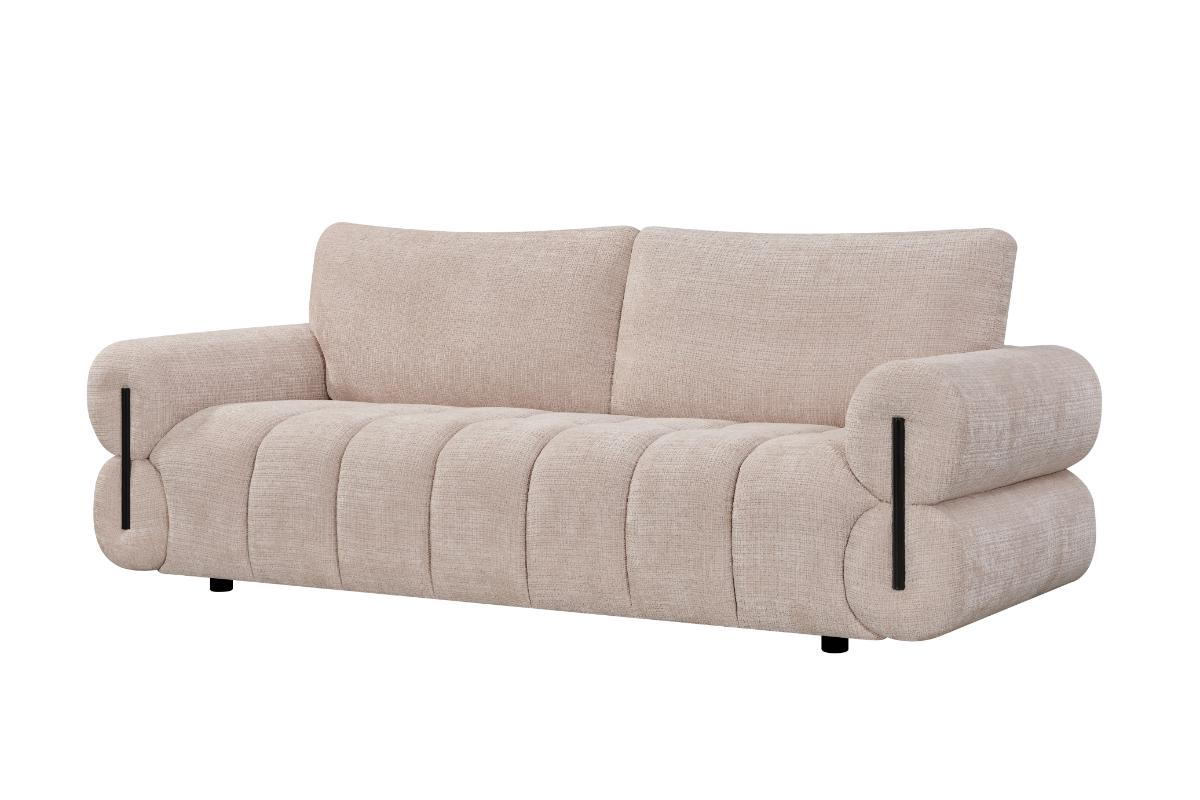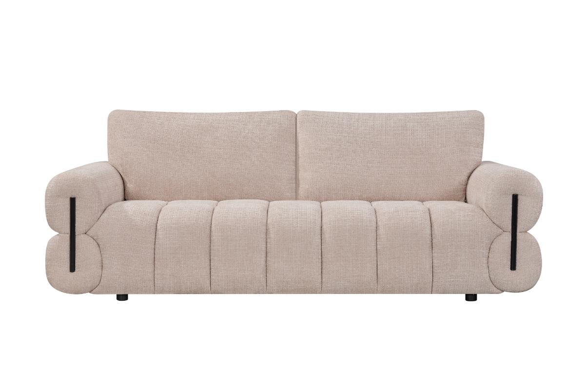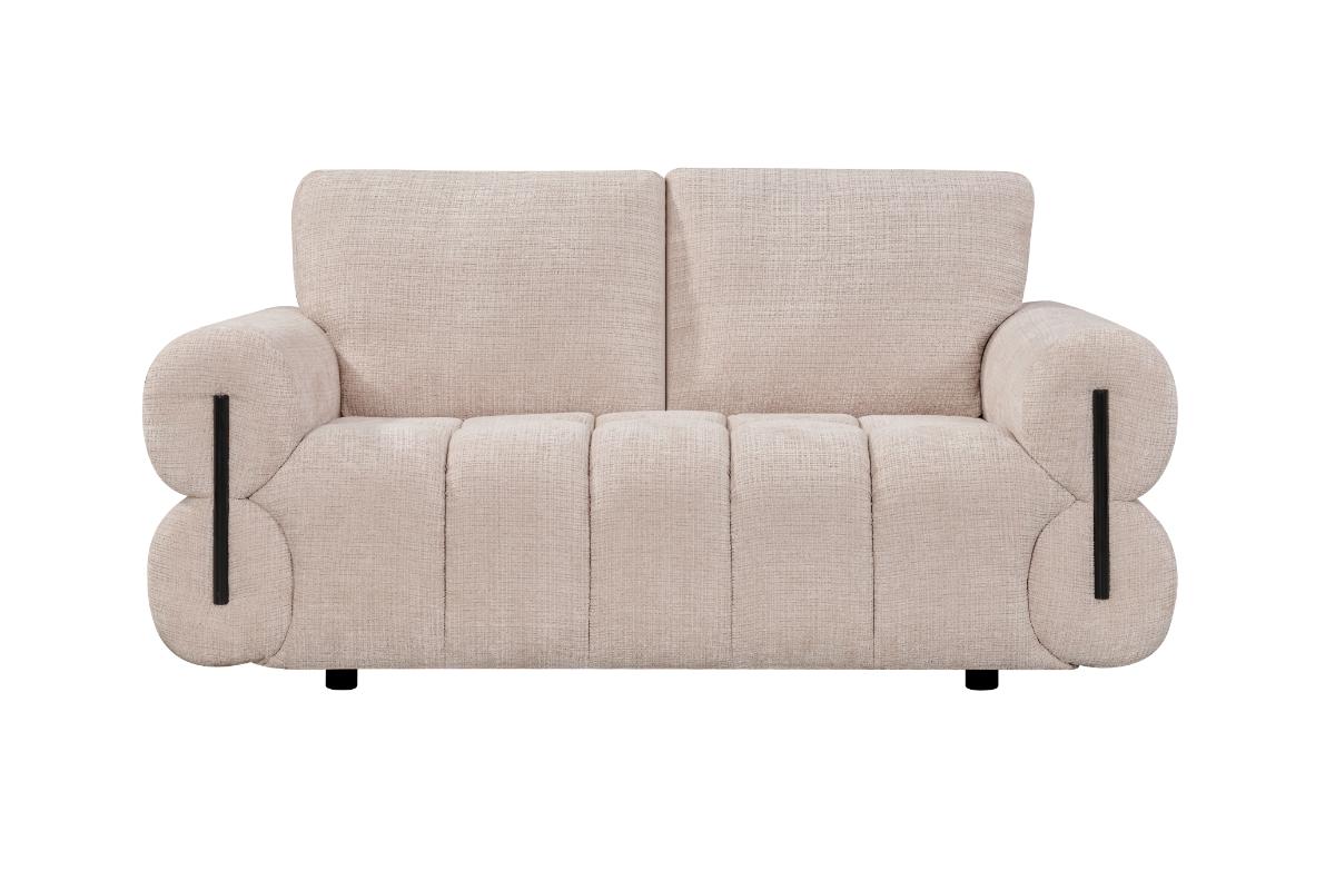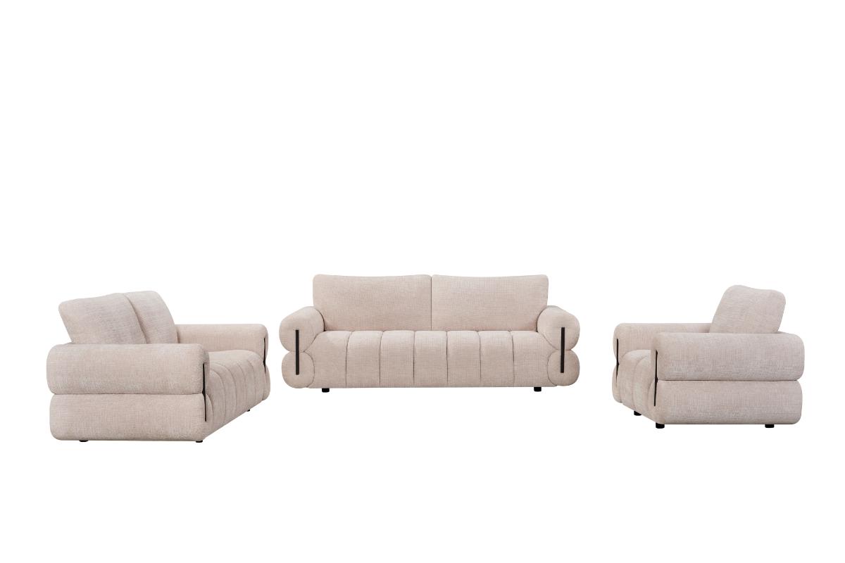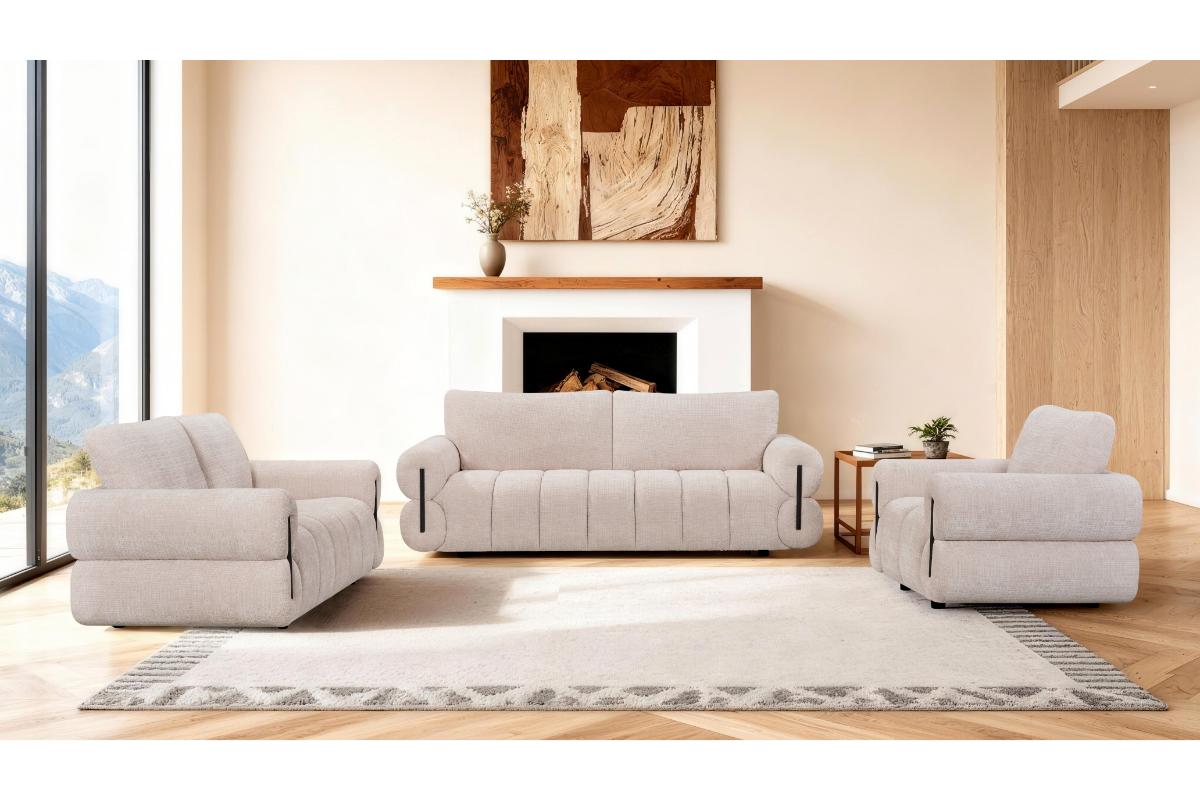Experience the perfect blend of modern sophistication and inviting comfort with our curated living room set. Each piece features a distinctive channel-tufted design and plush, oversized armrests that create a sense of grounded luxury. The neutral, sand-toned upholstery is soft to the touch and versatile enough to anchor any contemporary space. Elevated by subtle black accents and sleek, rounded silhouettes, this collection offers a refined aesthetic without sacrificing the cozy warmth your home deserves.